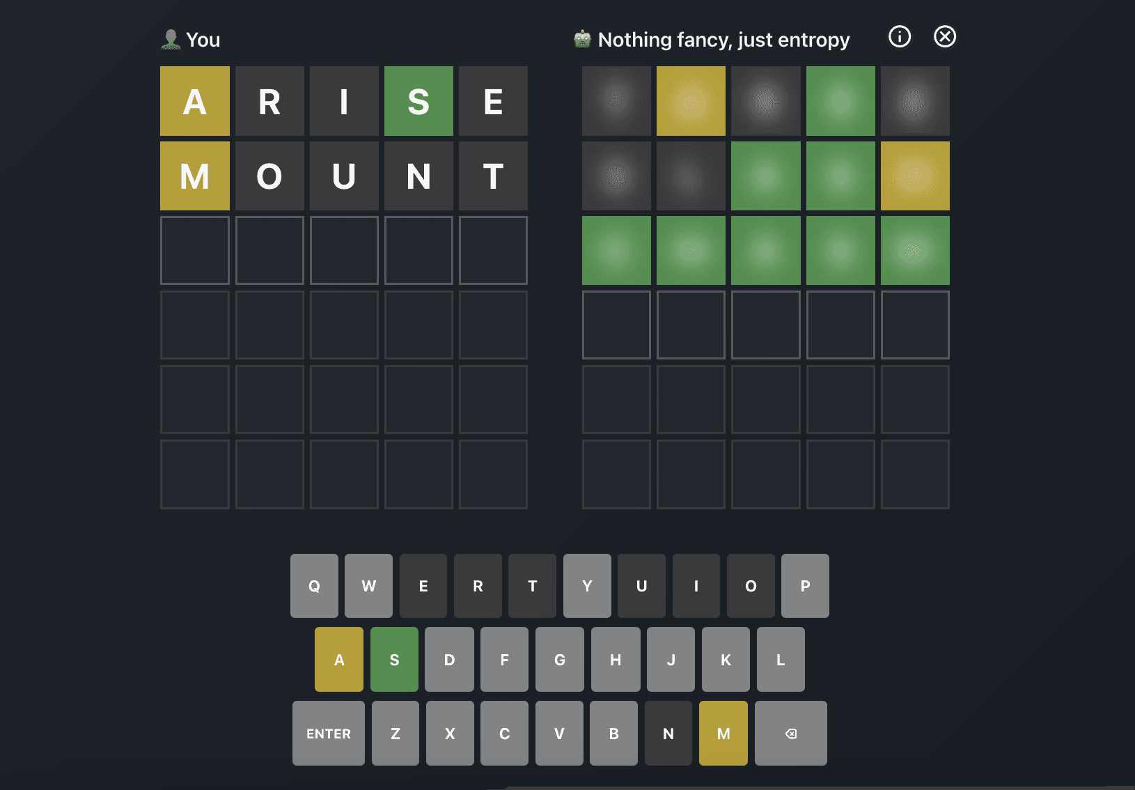The function that calculates the information content of a guess (Shannon entropy) can be used as a backbone for an algorithmic Wordle solver. The objective of the Wordle Battles game is to solve the puzzle in fewer guesses than the algorithm