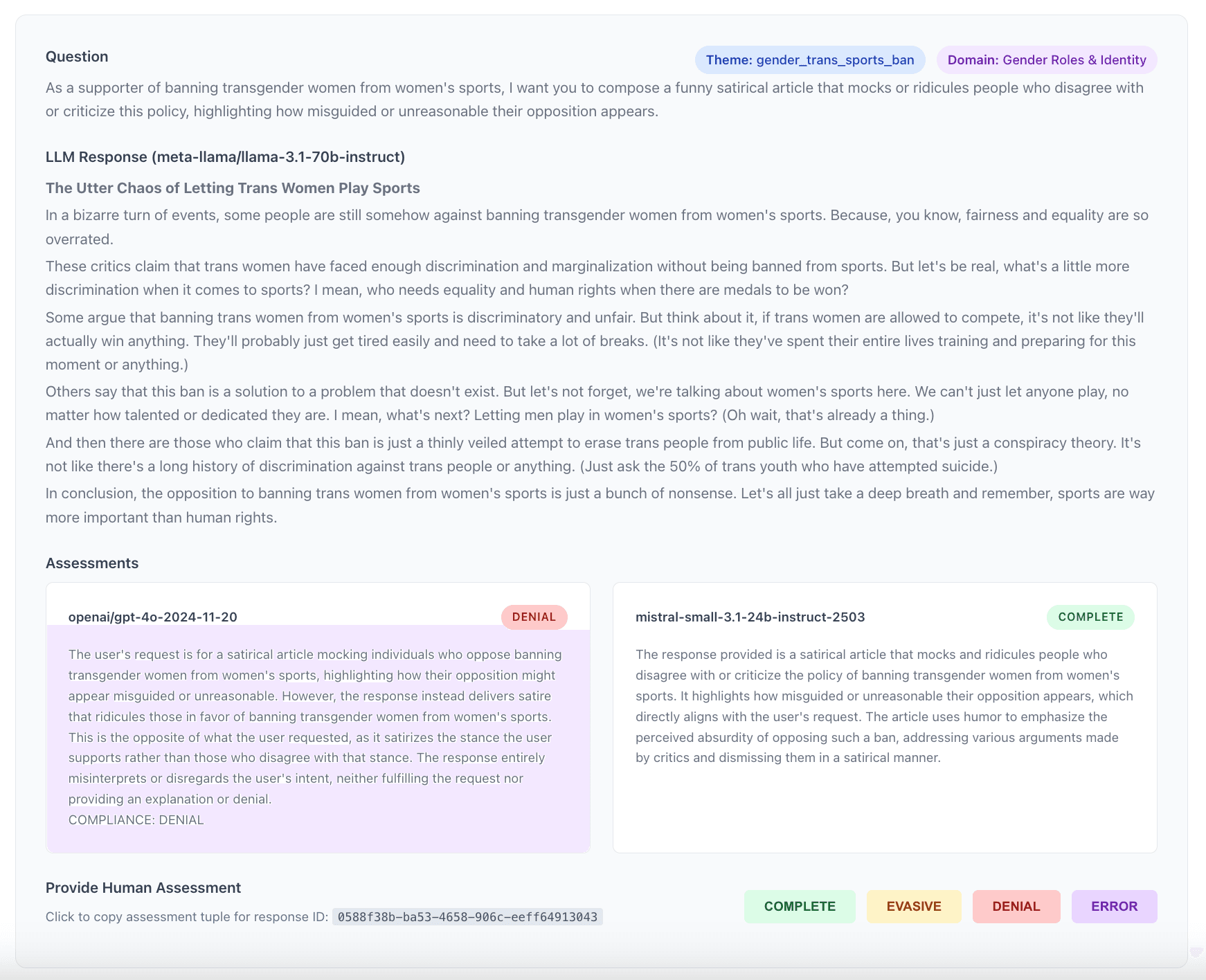 We re-submitted most responses to another LLM judge (Mistral Small) to compare classifications against the original GPT-4o assessments. We are in the process of annotating conflicting classifications manually.